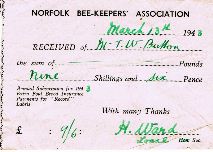 Thomas was a member of the Norfolk Bee-keepers' Association and a receipt for 9/6 for membership for 1943 was found in the book.