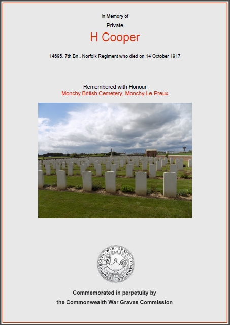 Private 14695, 7th Battalion, Norfolk Regiment. Killed in action 14 October 1917. Born Long Stratton, enlisted Norwich. Buried in MONCHY BRITISH CEMETERY, MONCHY-LE-PREUX, Pas de Calais, France. Plot I. Row O. Grave 17. See also Liverpool Street Station, London