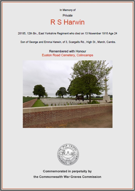 Private 28185, 12th Battalion, East Yorkshire Regiment. Killed in action 13 November 1916. Aged 24. Born North Runcton, Norfolk, enlisted aged 22 years 4 days at Norwich, resident Wood Lane Cottages, Tharston, Long Stratton, Norfolk. Born 30 June 1893 and baptised 6 August 1893 in North Runcton. Son of George and Emma Harwin, of 3, Scargells Road, High St., March, Cambs. Formerly 5342, 4th (Reserve) Battalion, Norfolk Regiment. Unmarried. Assigned British Expeditionary Force (B.E.F.), embarked Folkestone and disembarked Boulogne 27 September 1916. Posted to 1st/1st Battalion, Hertfordshire Regiment September 1916. Joined the 12th Battalion, East Yorkshire Regiment, for duty in the field 15 October 1916. Prior to enlistment he was a Yardman. Height 5 feet 4¼ inches, weight 8 stones 4 lbs, chest 34½ inches. In the 1901 census he was aged 7, born North Runcton, Norfolk, resident with his parents at Cottage, Hilton Lane, North Runcton, Norfolk. Admiited 17 September 1906 to Tharston School, Tharston, Norfolk. In the 1911 census he was aged 17, born North Runcton Norfolk, a Yard Boy and Bullock Tendler, resident with his parets at Wood Farm, Tharston, Long Stratton, Norfolk. Buried in EUSTON ROAD CEMETERY, COLINCAMPS, Somme, France. Plot IV. Row Q. Grave 5. See also March, Cambridgeshire